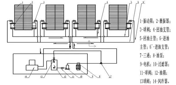 從圖3中可知:激振器整個潤滑系統(tǒng)由兩部分組成。一是工作潤滑部分,另是稀油站循環(huán)部分。工作潤滑部分是由激振器(2)、球閥(3)、回油支管(4)、回油主管(5)、進油主管(6)、進油支管(6’)等組成;稀油站循環(huán)部分是由油泵(8)、電機(9)、過濾器(10)、球閥(11和13)、油箱(12)、風冷器(14)及進回油管線組成。