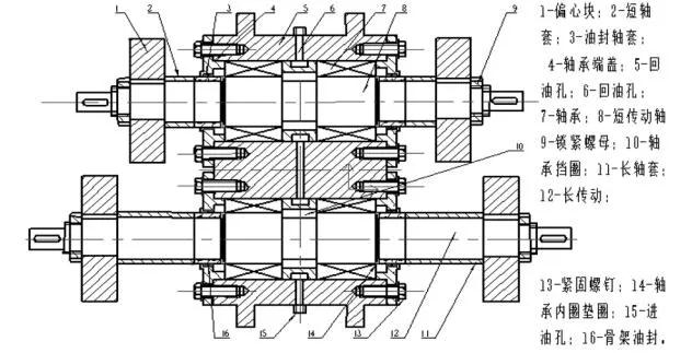從圖2可以看出:在激振器殼體(5)側(cè)面分別鉆通進油孔(15)和回油孔(6),在原來軸承凹迷宮端蓋的基礎上加裝兩個骨架油封(16)改為軸承端蓋(4),同時在原來凸迷宮端蓋上改為內(nèi)鑲兩道“O”形圈的油封軸套(3),另外在長、短傳動軸(8)、(12)的軸承(7)的軸向位置上,各增加一個軸承內(nèi)圈墊圈(14),壓緊軸承。